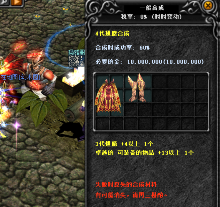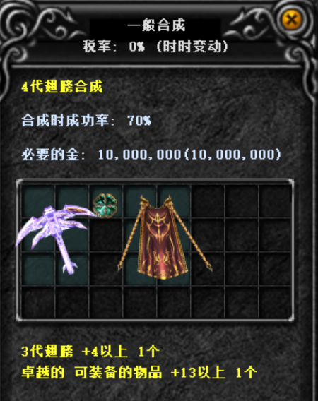 +4以上任意3代翅膀+任意卓越+13以上,需要5000万金币,最高30%(幸运符额外增加10%,共40%),失败全部材料消失。