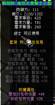 升级完成得到+0的血色套装,缺少的部位可以用老套或者强化套,同等级套装就行